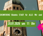 Pressekonferenz: Vorstellung des Bündnisses und der Forderungen Zeit: Dienstag, 20.01.2026 um 11 Uhr Ort: Stadtalm München (auf dem Dach des WERK3), Atelierstr. 10, 81671 München Anmeldung: per Mail an info@stadtfueralle.org Unsere stellvertretende Vorsitzende Susanne Krieger ist mit dabei!